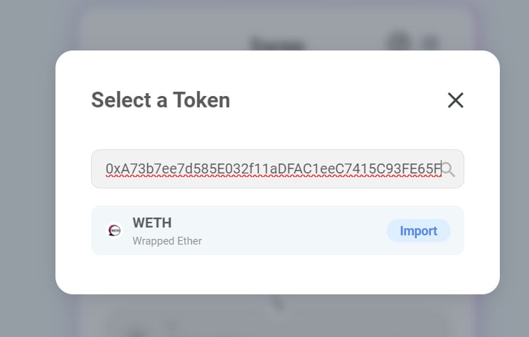 2. If you can't find the WETH token, paste this contract address and the WETH token will show up. Contract Address: 0xA73b7ee7d585E032f11aDFAC1eeC7415C93FE65F&#x20;